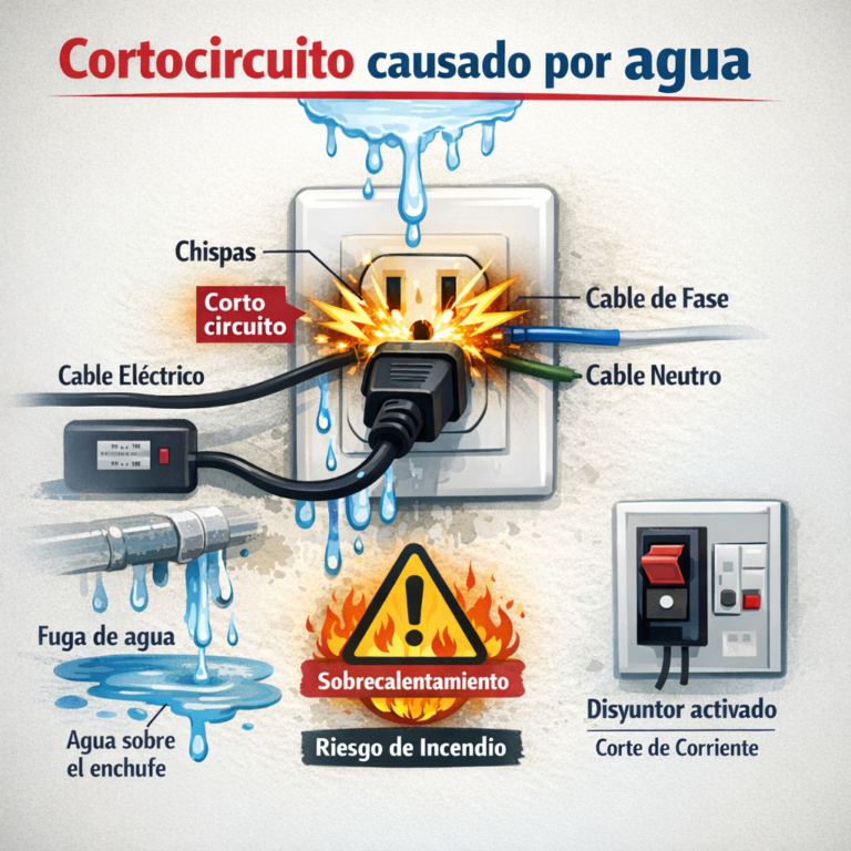 El agua es un conductor de electricidad (especialmente si contiene impurezas). Cuando el agua entra en contacto con cables eléctricos, enchufes, aparatos o componentes del cuadro eléctrico, puede crear un «cortocircuito». Esto significa que la corriente eléctrica toma un camino no deseado con muy baja resistencia, provocando una sobrecarga instantánea.