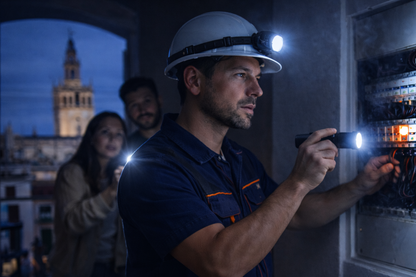 Ofrecemos servicio de electricista urgente 24 horas en Sevilla para fallos eléctricos nocturnos o de madrugada. Atendemos emergencias eléctricas en cualquier momento, sin esperas.